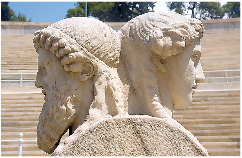 Saturne pour remercier Janus de l’avoir sauvé des foudres de son fils Jupiter en l’accueillant dans son royaume du Latium, lui offrit le pouvoir de connaître le passé et l’avenir d’où sa représentation d’un homme aux deux visages.
